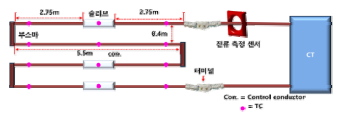 배치하였으며, 기준도체는 슬리브의 발열 정도를 비교할 수 있는 기준이 된다. 시험은 CT를 이용하여 도체에 전류를 인가하여 진행하였다.