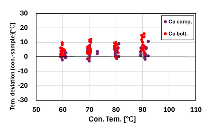 알루미늄 나전선의 접속부 발열양상과 동일한 양상을 나타내는지 비교를 위해 구리도체를 대상으로도 압착방식과 볼트방식 슬리브의 발열특성을 분석하였다.