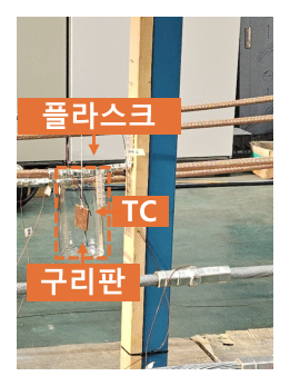 방법은 그림 5과 같이 위아래가 뚫려있는 플라스크 안에 구리판이 들어가도록 하고 그때 구리판을 TC를 이용하여 주위온도를 측정하는 방법이다. 그림 6은 현장에서 주로 사용되는 방법이다. 페트병안에 절연유를 넣고, 그 절연유의 온도를 TC로 측정하는 방법이다. 두 측정방법은 최대 약 0.1℃의 차이로