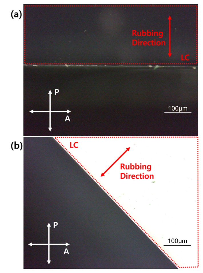 그림 4(a)는 수직 방향의 편광자와 검광자의 배치에 러빙 방향이 편광자와 동일한 방향으로 배치되었을 때의 현미경 사진이며, 그림 4(b)는 러빙 방향이 편광자와 45° 각도로 배치되었을 때의 현미경 사진이다. 빨간색 점선으로 표시된 영역은 액정 셀 내 액정이 주입된 상태이다. 그림 4(a)에서는 빛이 차단되며, 그림 4(b)에서는 빛이 투과됨을 볼 수 있다. 이는 주입된 액정이 러빙된 방향의 미세 홈을 따라 잘 배열하여 그림 4(a)에서는 수직인 편광자와 검광자에 의해 빛이 차단되고, 그림 4(b)에서는 편광자에서 편광된 빛이 굴절률 이방성을 갖는 액정 분자에 의해 45°로 배열된 액정층을 따라 원편광되어 검광자로 투과되는 것을 보여준다. 이를