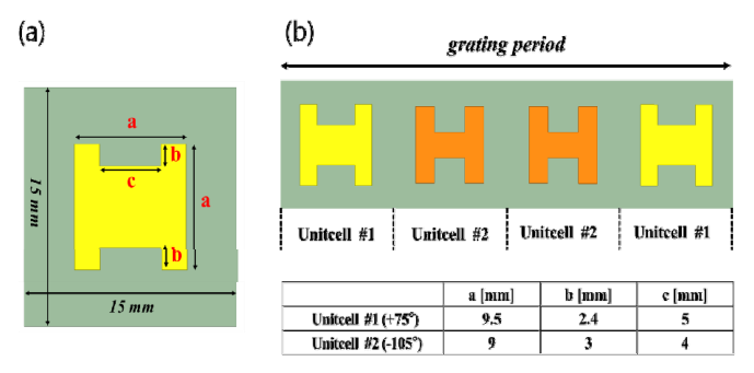 만들 수 있다. 또한 좌우 대칭적인 구조로 설계하는 균등 분할 메타표면에 활용하였다[16]. 사용된 기판은 Rogers 4003이며 두께가 1.6 mm, 유전율이 3.55, tan δ는 0.0027이다. 그림 3(b)와 같이, 격자간격 내에 설계된 2개의 단위 셀을 2번씩 반복하여 배치함으로써 2π의 위상변화량을 충족하였다.