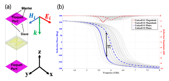 그림 4. 단위 셀 시뮬레이션; (a)Floquet port 시뮬레이션 설정, (b)반사계수 위상