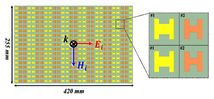 그림 5는 제작을 위해 설계된 메타표면의 전체모습을 나타내며, 총 7 × 15의 격자구조가 배열로 구성되었고 전체 크기는 420mm × 255mm이다. 메타표면을