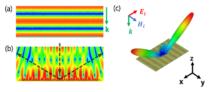HFSS를 이용해 설계된 메타표면에서의 반사파 특성을 확인하는 원거리장 시뮬레이션 작업을 수행하였다. 그림 6(a)는 메타표면에 수직 입사하는 평면파를 나타내며, 그림6(b)와 (c)는 반사파의 전기장 분포를 보여준다. 시뮬레이션 결과를 통해서도 알 수 있듯이, 메타표면에 입사되는 전파의 전력이 양방향으로 분산되어 반사됨을 확인할