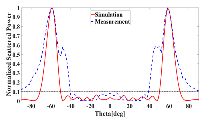 측정 결과(그림 8), 반사파의 주엽(main lobe)은 ±58°에서 측정되어 메타표면 중심을 기준으로 균등한 전력이 대칭 분할되었음을 알 수 있으며, 또한 시뮬레이션