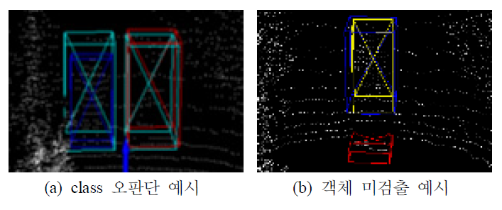 그림 5는 객체 오검출 예시를 시각화한 것이다. 예시의 (a)는 모델이 class를 오판단했을 때의 예시로, 하늘색 cuboid는 모델이 장애물이라고 예측한