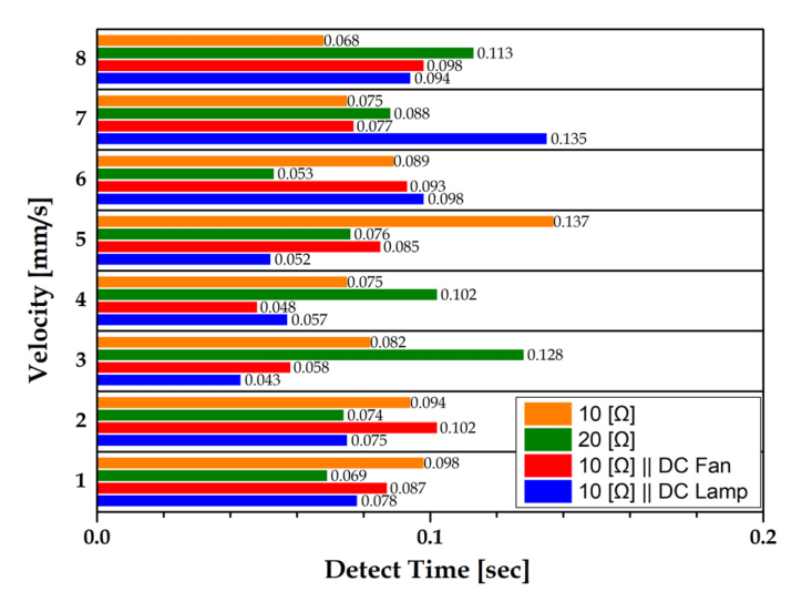 + DC Fan, $v$=1 [mm/s], (d) Resistor 10 [$\Omega$] || DC/DC Converter + DC Lamp, $v$=1