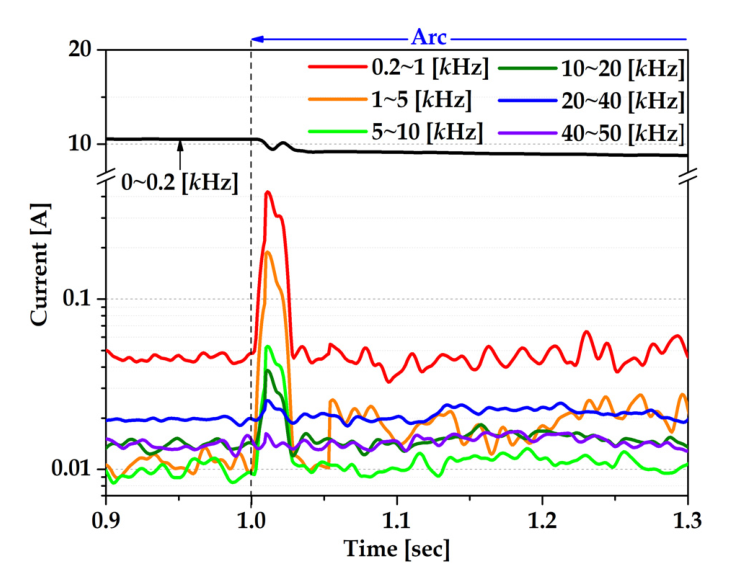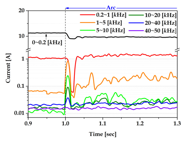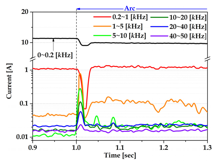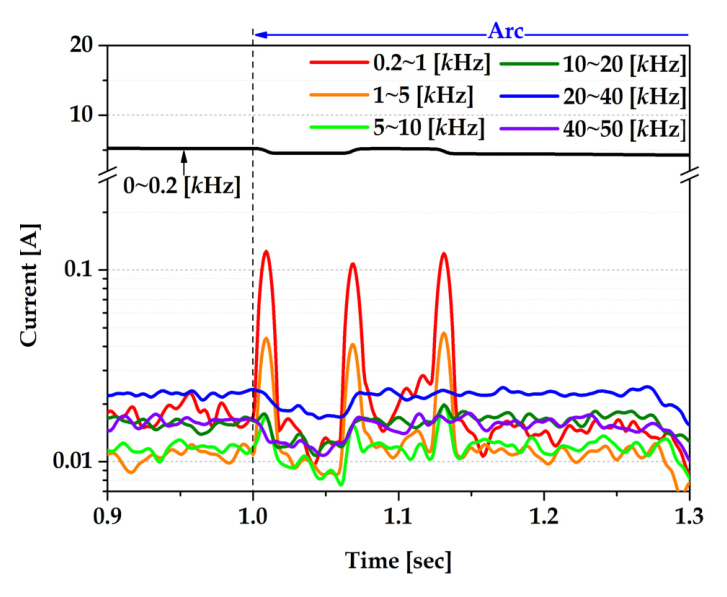 집중되어 있으나, 0.2-1 [kHz] 대역에서 약 1 [A] 수준의 전류 성분이 포함되었다. 아크 발생 이후 0.2-1 [kHz] 대역에서 전류