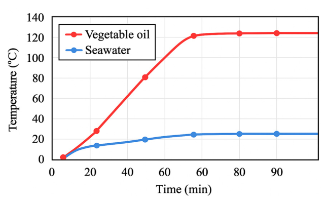 Fig. 7. Temperature variation of vegetable-oil thermal medium and seawater.