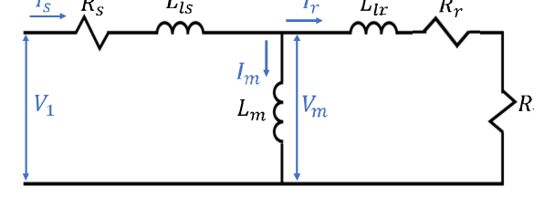 자화 인덕턴스, $s$ 는 슬립을 나타낸다. $I_s, I_r, I_m$ 은 각각 고정자 전류, 회전자 전류, 자화전류이다[8],