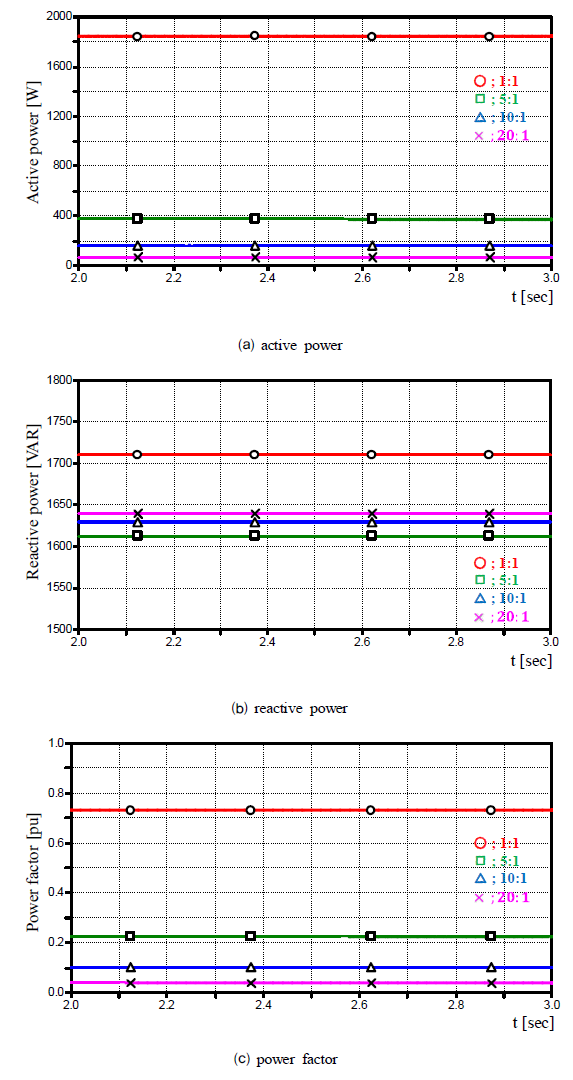 그림 3은 동일한 부하 토크 조건에서 기어 감속비를 달리하였을 때 유효전력, 무효전력 그리고 역률의 변화를 모의한 결과이다.