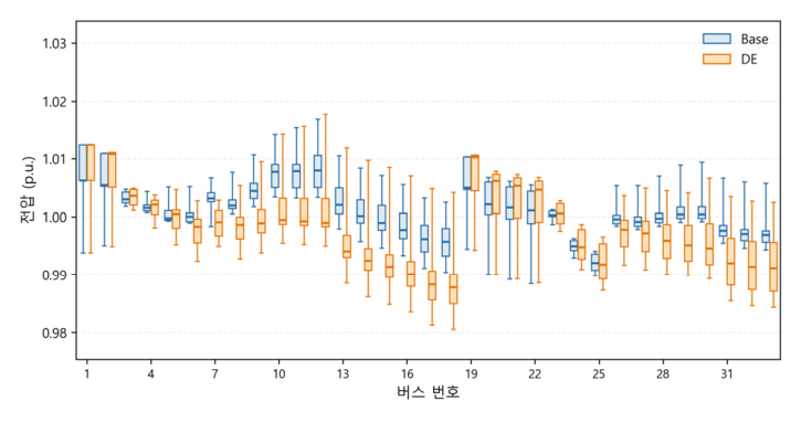 Differential Evolution을 이용한 가중치 최적화를 수행하였다. 가중치 최적화 결과, 전압 허용 범위는 기존과 동일하게 안정적으로 유지되었으며,