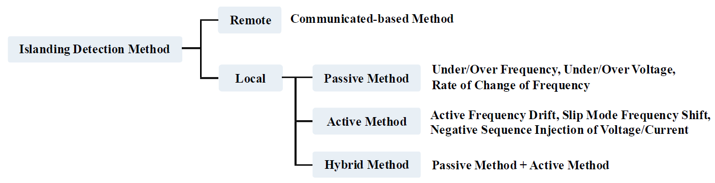 단독운전 감지 방법(Islanding Detection Method, IDM)은 크게 Remote 방식과 Local 방식으로 나눌 수 있다. 첫 번째로 Remote 방식에는 통신 기반 방법(Communication-based Method)가 있다. 차단기나 개폐기의 상태를 모니터링하고 서로 통신하여 단독운전을 감지하는 방법이다. 감지 성능은 인버터 제어 방식에 구애받지 않고, 가장 빠르고 정확하다. 하지만 비용 문제와 통신 인프라에 의존도가 높다. 두 번째 Local 방식에는 수동식 방법(Passive Method), 능동식 방법(Active Method), 수동식과 능동식을 결합한 하이브리드 방법(Hybrid Method)이 있다. 수동식 방법은 주파수나 전압, 고조파 등의 전기량을 단순히 측정하여 단독운전을 감지하는 방법이다. 하지만 특히 GFM과 같이, 단독운전 전후 크게 차이가 나지 않는 상황에서는 검출이 불가능할 확률이 커진다. 능동식 방법은 의도적으로 외란이나 섭동을 주입하여, 전압이나 주파수 등의 반응을 관찰하는 방법이다. 수동식 방법에 비해 검출 불가 영역(Non-Detection Zone, NDZ)이 작아 감지 성능이 더 우수하다. 그러나 계통에 연결되어 있는 경우에 섭동이나 외란을 주입하면 계통에 불안정성을 야기할 수 있다[3, 7- 9]. 하이브리드 방법은 수동식 방법과 능동식 방법을 결합한 방법이다. 전압이나 주파수와 같은 수동식 지표를 통해 단독운전이 의심되는 경우에만 능동식 방법을 활성화하는 방식이다. 이러한 방식은 능동식 방법의 외란 주입으로 인한 전력 품질 저하를 최소화하면서도, 수동식 방법의 검출 불가 영역을 보완할 수 있다[10].