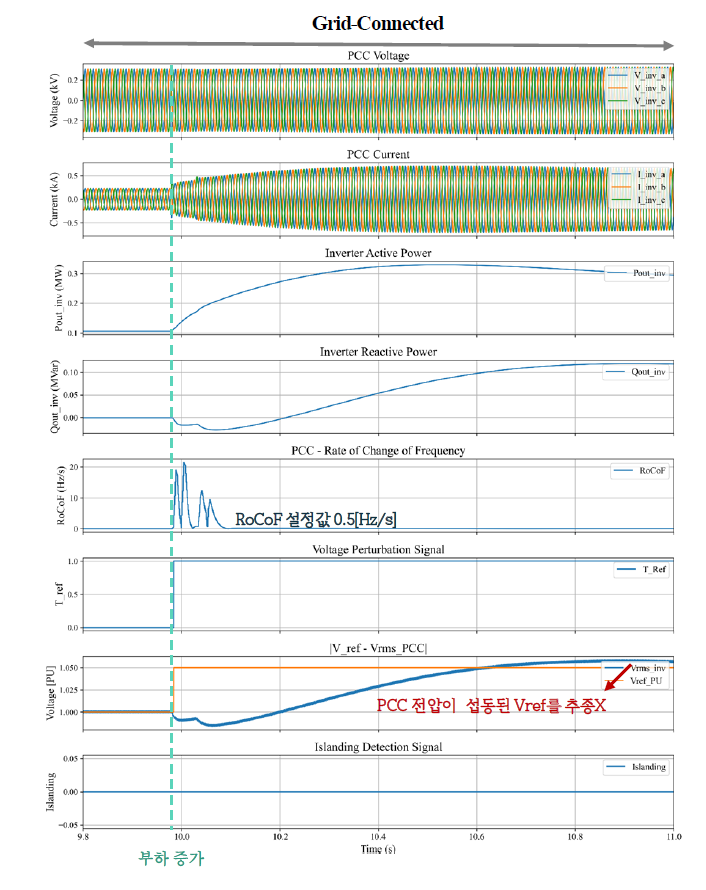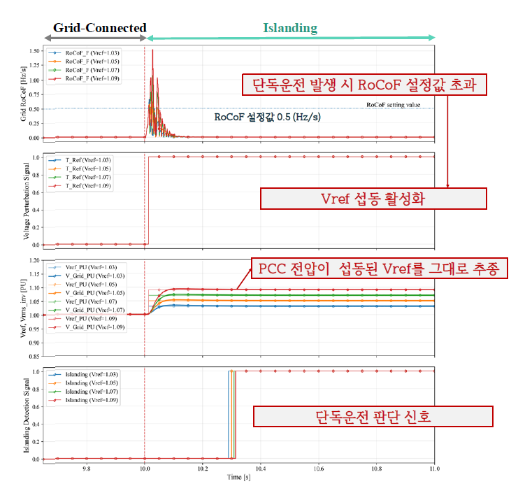 이후 인버터의 출력전압이 섭동이 반영된 를 얼마나 추종하는지에 따라 단독운전을 판별한다. 그 차이가 0.01 (PU)보다 작으면 단독운전이라고 판단한다.