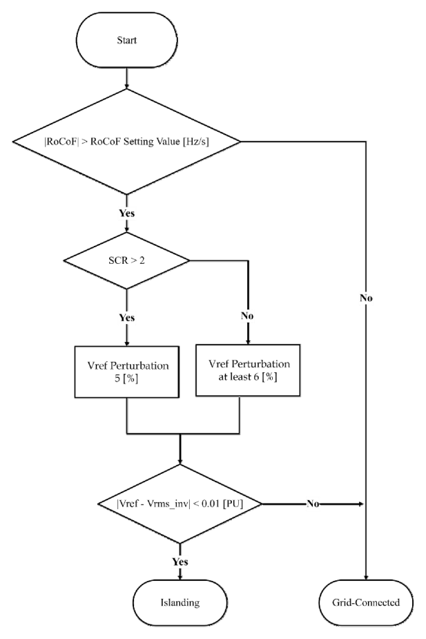 Grid-Forming, Islanding Detection Method, Voltage Reference Perturbation, Rate of Change of Frequency, Short Circuit Ratio