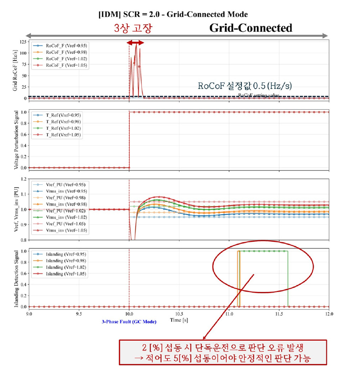 만약 RoCoF가 이 설정값을 초과하면 2차적으로 GFM의 입력인 를 섭동시킨다. 이는 고장과 같은 과도현상과 단독운전을 분리해 판별하기 위함이다. 연계 상태에서는 계통 전압을 우선적으로 따라가기 때문에 이 섭동에 크게 반응하지 않을 것이다. 하지만 단독운전 상태에서는 GFMI이 전압을 형성하는 주체이기 때문에 이 섭동에 반응하게 된다.