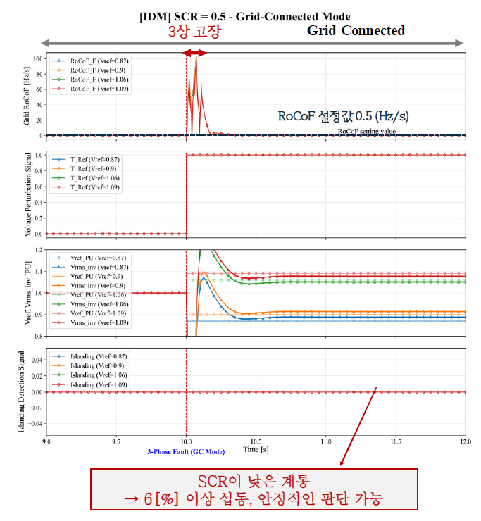 SCR이 낮으면 계통은 전압 및 주파수의 불안정도가 증가해 계통 전압을 추종하는 방식인 GFLI의 동작은 불안정할 수 있다. 반면 SCR이 높으면 강인한 계통이기 때문에 전압이 상대적으로 안정적으로 유지된다.