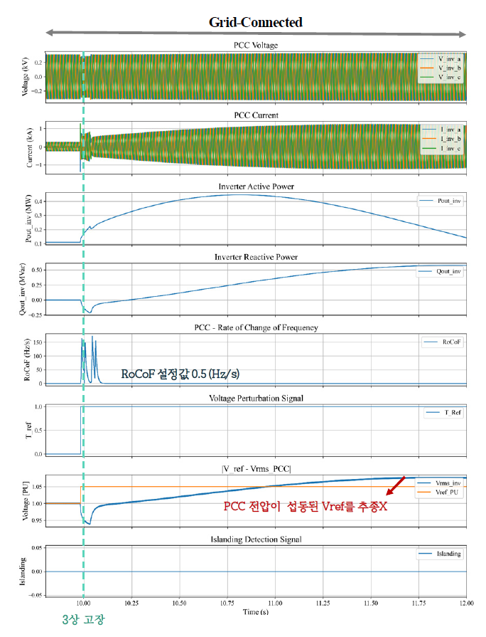 시험 계통에서 GFM 인버터의 단독운전 상황을 모의한 결과, 단독운전 발생 전후에 PCC 전압 및 주파수에서 유의미한 변화를 관측하기 힘들다. 이는 정상 전압 범위인 0.88~1.1(PU) 및 정상 주파수 범위 59.3~60.5(Hz)를 벗어나지 않는 NDZ에 해당하는 운전 상태임을 확인했다. 이러한 결과는 GFM의 전압과 주파수를 자체적으로 형성하고 외란에 대해 자율적으로 유지 및 보상하려는 특성에 기인한다. 따라서 기존의 단독운전 검출 방식 중 Passive Method은 GFM 인버터가 연계된 경우에는 적용하기 어려워진다.