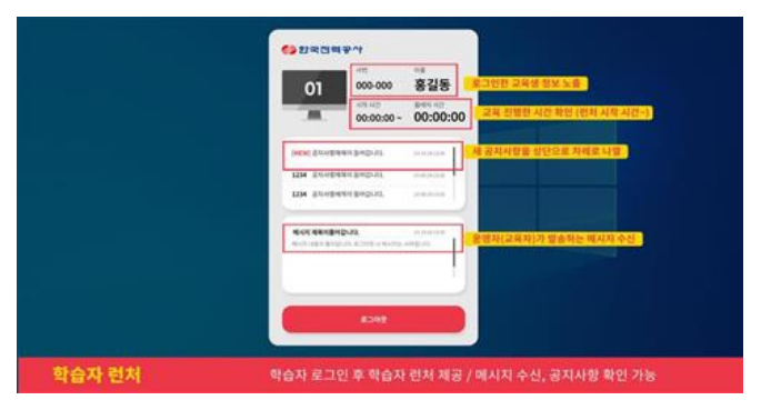 운영 효율성을 높이기 위한 설계이다. 아울러 안전 교육훈련 콘텐츠의 실행, 중지 및 전환을 제어할 수 있으며, 학습자들에게 공지 및 피드백 메시지를