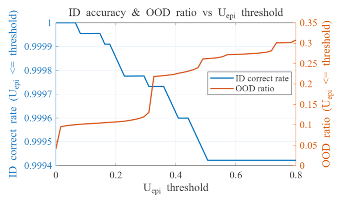 신뢰 가능한 예측으로 채택한다고 가정했을 때의 ID 정확도와 OOD 비율 변화를 나타낸다. 실험 결과, $U_{epi} = 0$ 근방의 매우 낮은