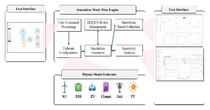 시뮬레이션 워크플로우 엔진은 HELICS 기반으로 구현되었으며, 다수의 페더레이트를 시간 동기화하여 통합 Co-Simulation을 수행한다. HELICS