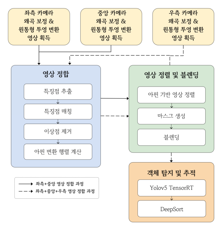 영상으로 정합한다. 두 번째 단계는 객체 검출 및 추적 단계이다. TensorRT로 최적화된 YOLOv5[7]를 이용하여 객체를 검출하고, DeepSORT 알고리즘[14]을 기반으로 추적한다.