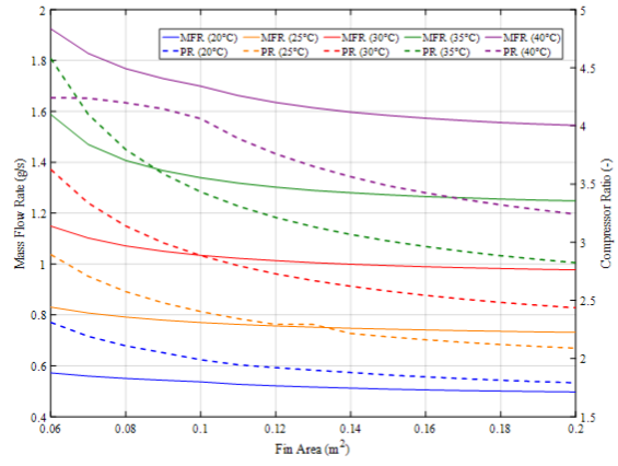 Fig. 10은 핀 면적($A_{fin}$)을 0.06 m²에서 0.20 m² 까지 변화시킬 때, 외기온도별 시스템의 질량유량(MFR)과 압축비(PR)의 변화를