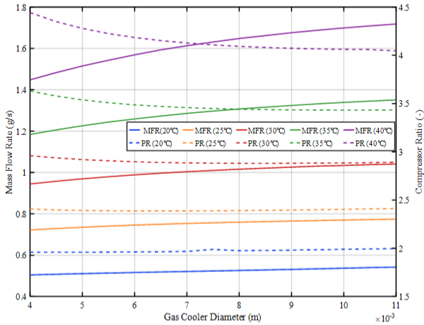 상승하는 경향을 보였다. 이는 핀 면적 증가가 가스쿨러의 열전달 성능을 향상시켜 가스쿨러 압력을 낮추고, 결과적으로 압축비(PR)와 소비전력이 감소하기