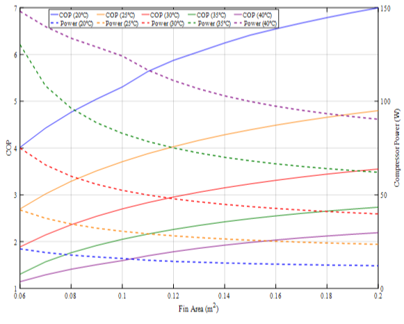 Fig. 8은 핀 면적($A_{fin}$)을 0.06-0.20 m²까지 변화시키며, 모든 온도 조건에서 핀 면적이 증가함에 따라 압축기 소비전력은 감소하고 COP는