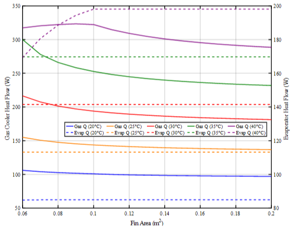 Fig. 9 Gas cooler and evaporator heat flow rate vs. fin area under various outdoor