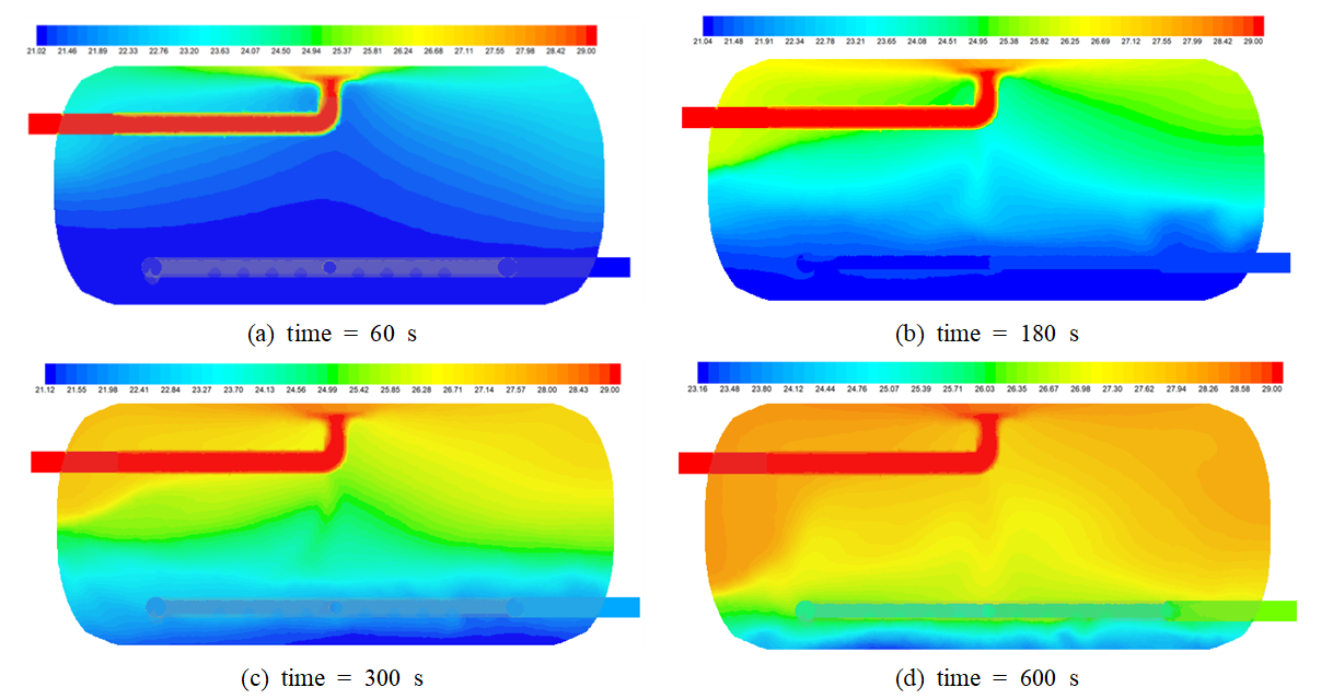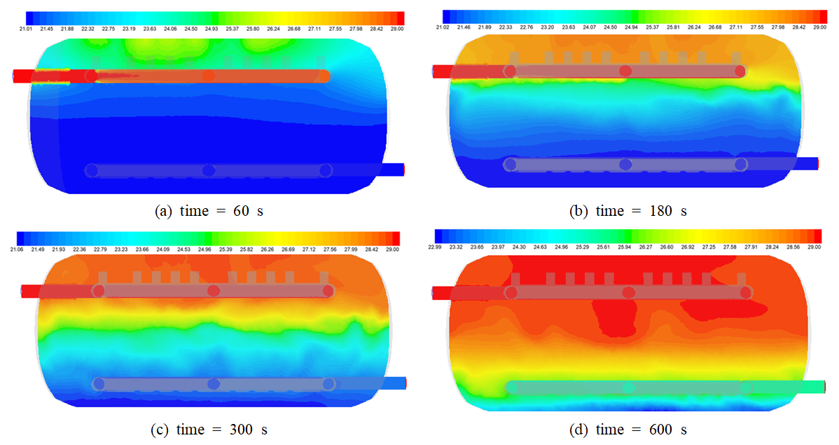 거동으로 전환됨을 확인할 수 있다. Fig. 3(a)-(d)은 십자형 배관으로 연결된 루프형 매니폴드의 상부에 20개의 노즐이 설치된 Case 2인 경우, 시간경과에 따른 탱크 단면 온도분포를 나타내고 있다.