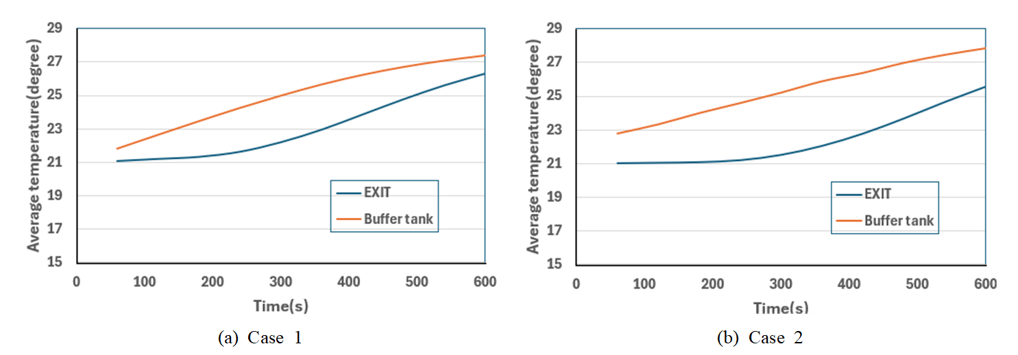 1에 나타난 배출구와 버퍼탱크의 평균온도는 Fig. 4(a)와 같이 고온수 유입시간이 경과에 따라 모두 상승하는 유사한 추세를 보이면서 두 온도 간 차이가 상대적으로 좁게 유지되는 특성을 나타내었다. 이는