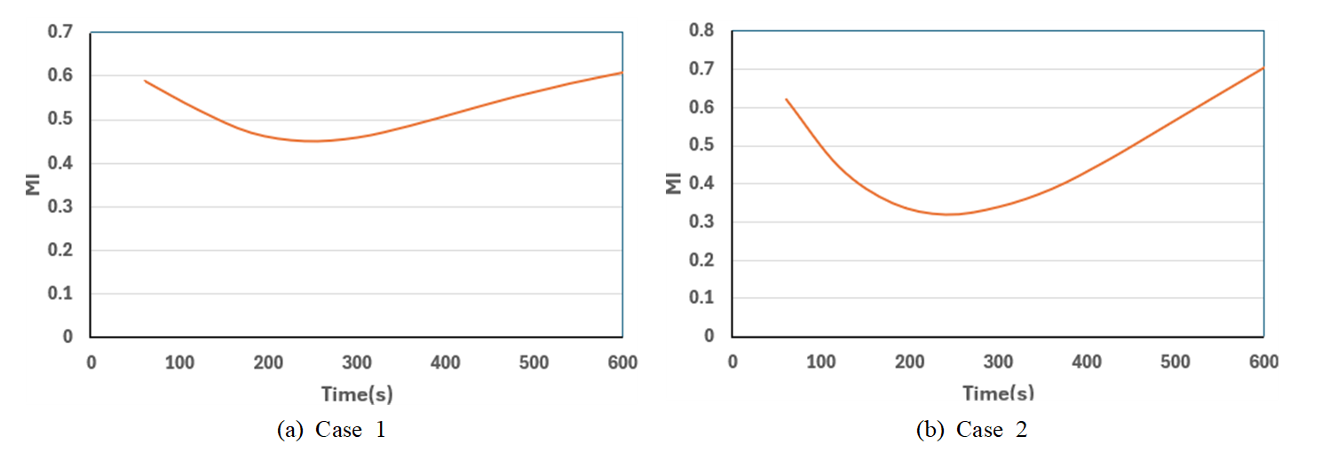 성층이 뚜렷하고 혼합 억제가 효과적으로 이루어져 버퍼탱크 내에서 보다 안정적인 층상유동 유지에 유리한 조건임을 확인할 수 있다. Fig. 5는 노즐의 설치방식에 따라 차이 나는 혼합지수(MI) 변화를 나타내고 있다. Case 1의 경우 Fig. 5(a)와 같이 배출구와 버퍼탱크의 평균온도 차이가 크지 않았던 Fig. 4(a)의 결과와 일치하게 혼합지수 또한 초기 약 0.6 수준에서 250 s 경과하면 0.43까지 점차 감소한 뒤 다시 상승하는 U자형 경향을 나타냈다.