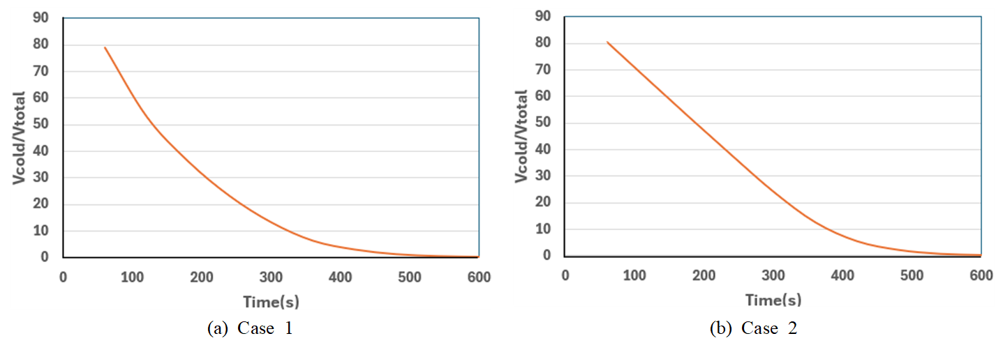 우수하다. 결과적으로 400s 경과하여도 소량의 저온영역이 존재함을 확인할 수 있다. 종합적으로 평가하면 Case 2가 Case 1보다 Vcold/Vtotal