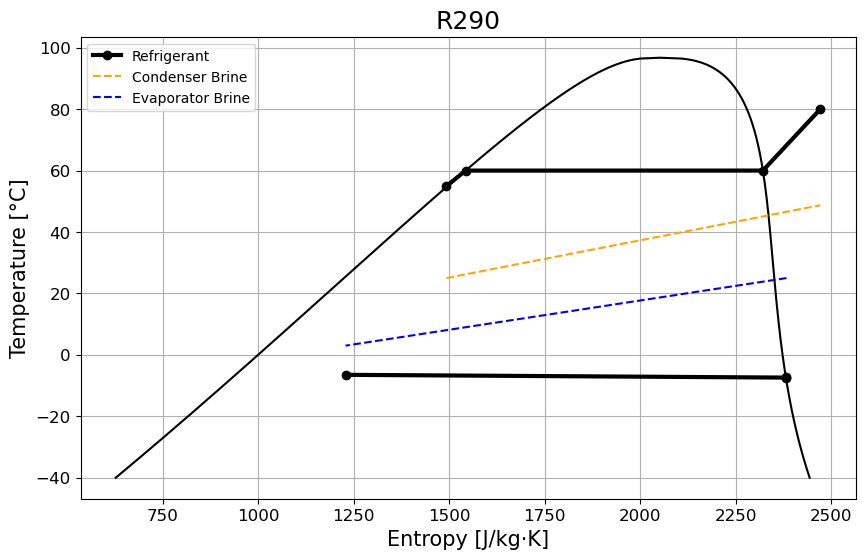 Fig. 10. T-s diagram of pure R290 refrigerant.