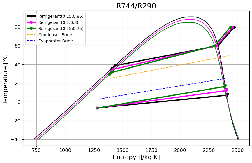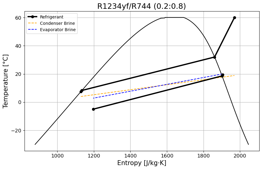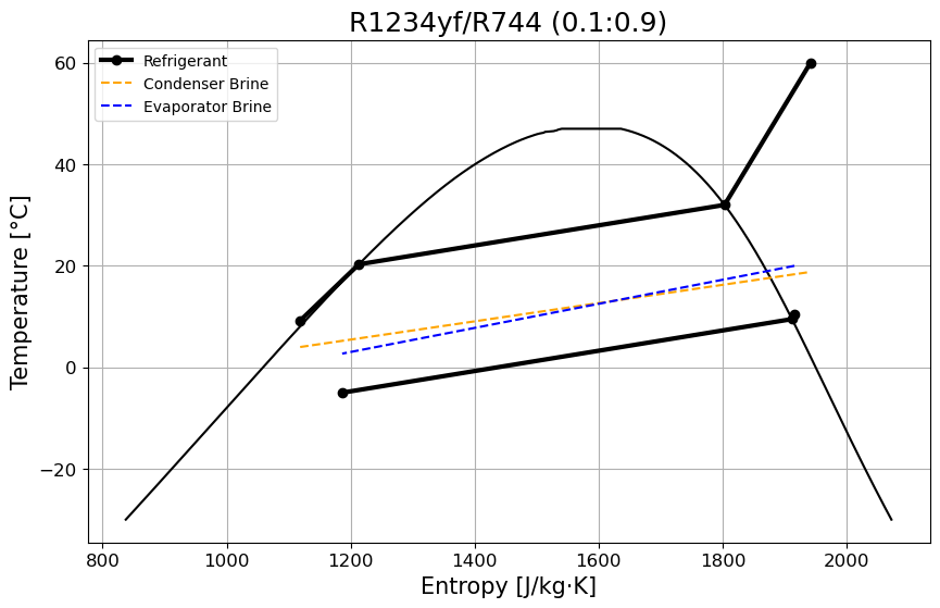 시뮬레이션 결과를 Fig. 9 ~ Fig. 13의 각 혼합 냉매에 대한 Ts선도의 포화곡선상에 나타내었으며, 주황색 점선과 파란색 점선은 각각 응축기/증발기 브라인의 온도 변화과정을 의미한다.