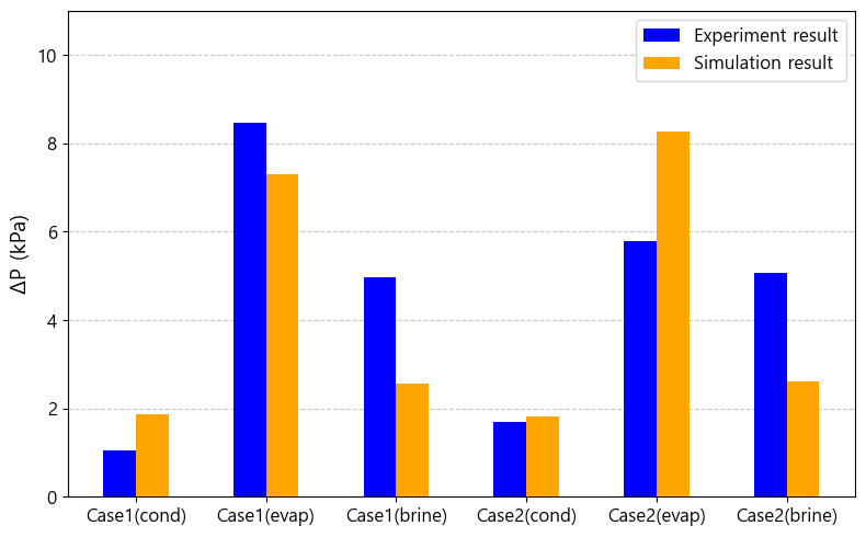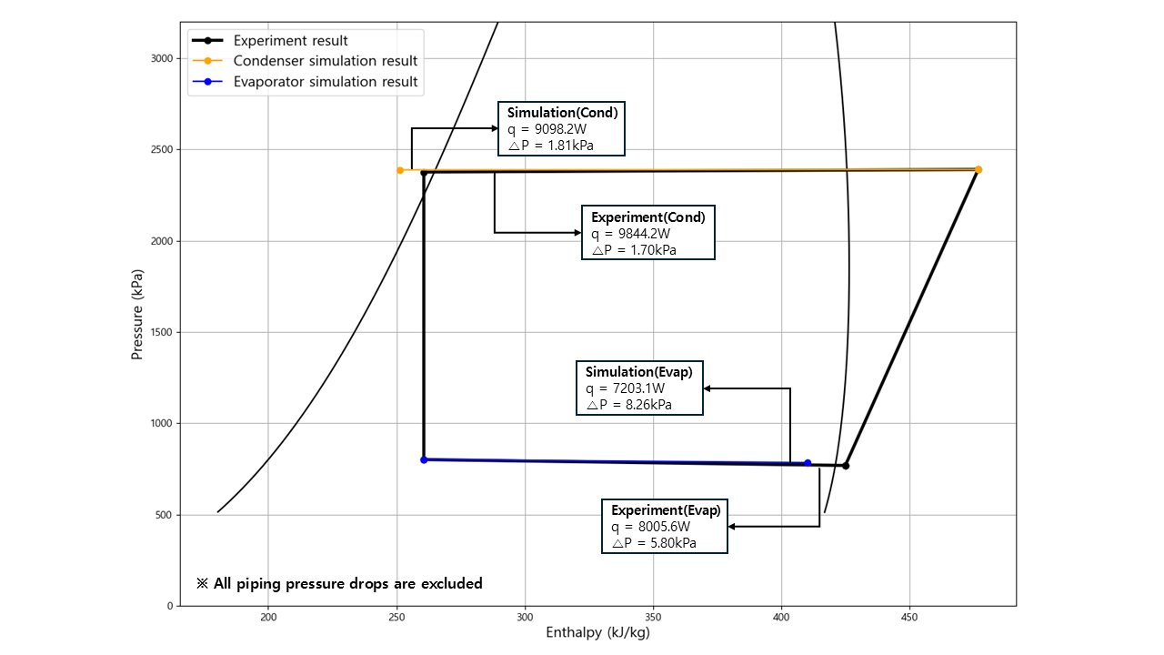 오차를 보였다. 증발기에서는 Case 1이 2.32%, Case 2가 10.02%의 오차를 보여, 평균 약 6.17% 수준으로 나타났다. 또한 압력강하의