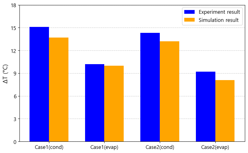 결과를 나타낸다. 각 상황별 열전달량의 오차를 분석한 결과, 응축기에서는 Case 1이 8.48%, Case 2가 7.58%로, 평균 약 8.03%의