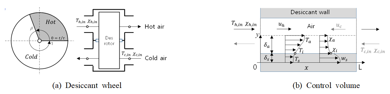 Fig. 1에 제습휠의 전면과 내부 유로의 종단면을 개략적으로 도시하였다. Fig. 1(b)는 회전주기가 $\tau$인 Fig. 1(a)의 대향류 제습휠에서 고온 구간($0\le t/\tau\le\beta$) 에서는 유로의 왼쪽 끝($x=0$)으로 고온 유체($T_{h,in}$, $\chi_{h,in}$)가