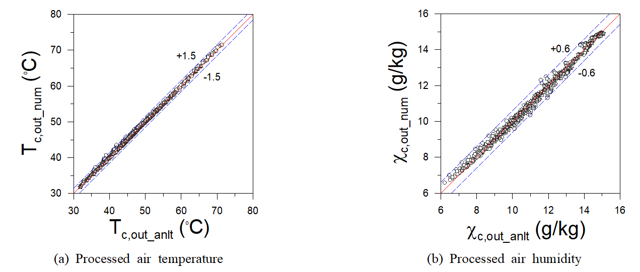 저온 공기의 분포 즉, $\widetilde{T}_{a, c}(\xi)$와 $\widetilde{\chi}_{a, c}(\xi)$는 식(39) ~ 식(40)의 우항에서 $F_{h}(\xi ,\: \lambda)$를 $F_{c}(\xi ,\: \lambda)$로 대체(Table 2 참조)하여 얻을 수 있다. 이상의 근사해를 사용하면 제습휠 내부 유로의 임의의 위치 $\xi$에서 평균 온도와 습도를 예측할 수 있다. 다음 절에서