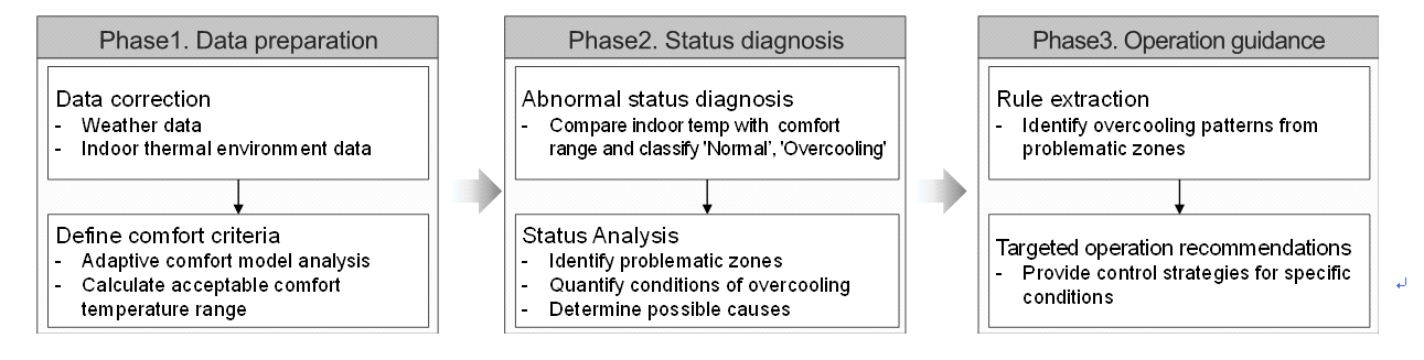 제안하였다. 제안된 프레임워크는 데이터 전처리, 적응형 쾌적 모델 기반의 상태 진단, 과냉 원인 분석 및 운영 효율화 전략 제시의 3단계로 구성된다.