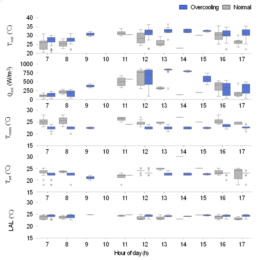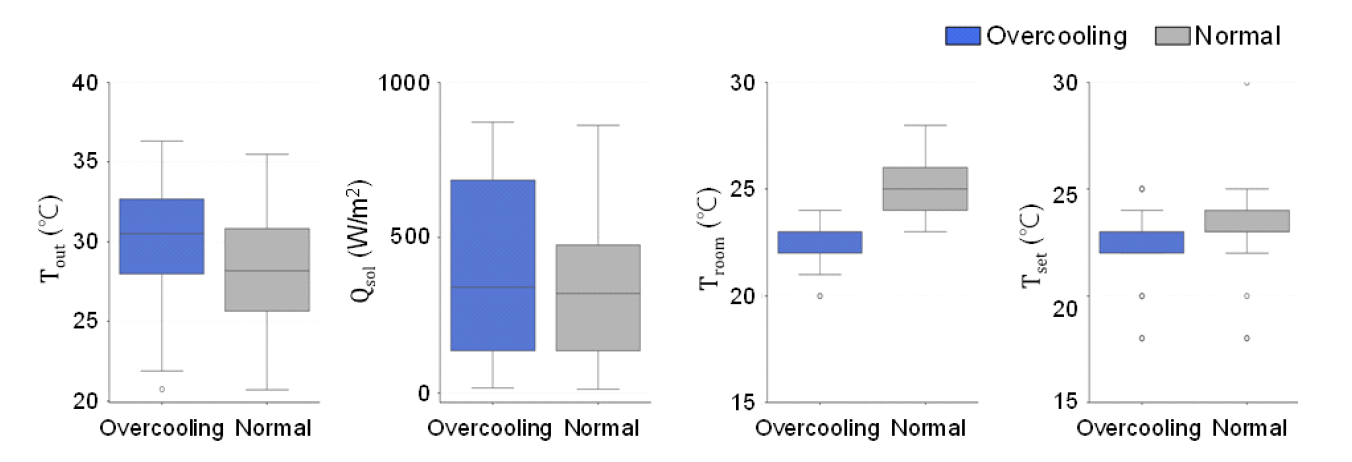 Fig. 7은 과냉 그룹과 정상 그룹의 시간대별 주요 환경 변수(실외온도, 일사량, 실내온도, 설정온도)의 분포를 박스플롯으로 비교한 결과이다. 과냉이 발생하는
