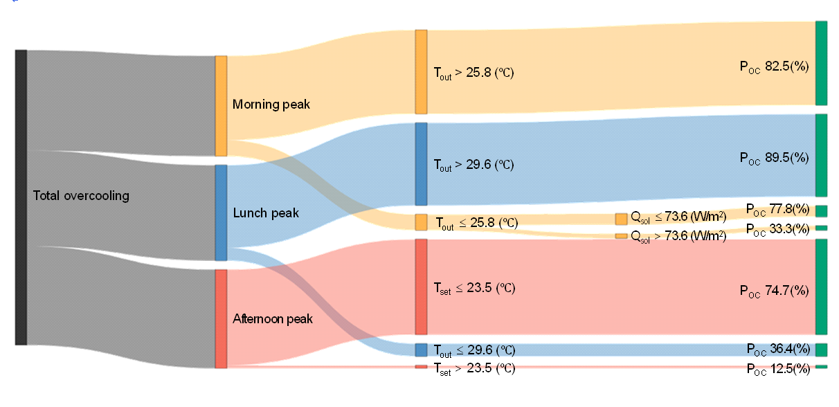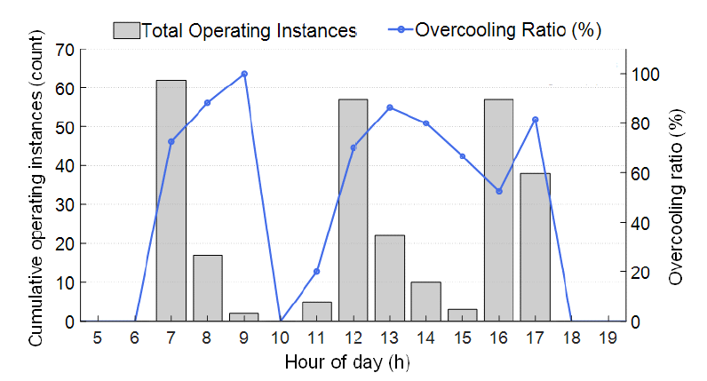 해당하였다. 점심 시간대에는 실외온도가 29.6°C를 초과하는 고부하 상황에서 과냉 발생 확률이 89.5%로 가장 높게 나타났고, 이는 전체 과냉의