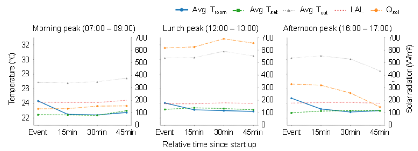확인할 수 있다. 오후 시간대 분석 결과 일사량 감소로 실제 냉방 부하가 줄어드는 상황에서도 실내온도는 안정화되지 않고 30분 이상 지속적으로 하강하였다.
