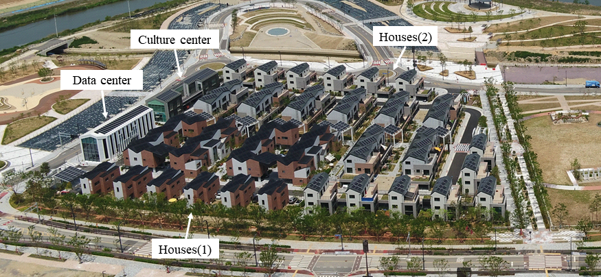 스마트 빌리지 커뮤니티는 Fig. 1의 조감도와 같이 커뮤니티 내 주거 건물인 주택, 비주거 건물인 데이터센터와 문화센터로 구성이 되어 있다. 이 커뮤니티에는 태양광(BIPV), 지열,