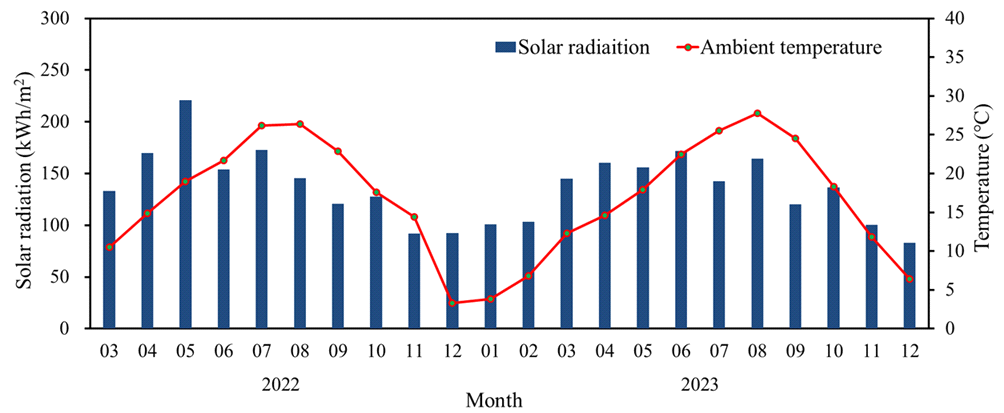 하강하였으며 이달 최고온도는 17.2℃, 최저온도는 -12℃로 나타났다. 수평면 전 일사량은 2022년도 5월에 221.1 kWh/m2으로 가장 높았고 2023년도는 6월에 171.1 kWh/m2로 가장 높이 나타났다. 태양고도가 낮은 2022년 12월과 2023년 12월에는 각각 921 kWh/m2, 82.9 kWh/m2로 낮은 분포를 보였다.