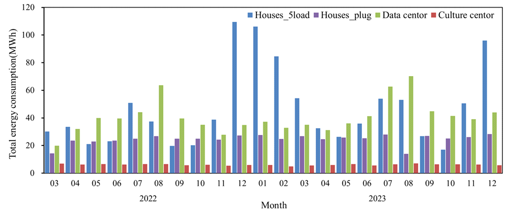 커뮤니티를 구성하는 주택, 문화센터, 데이터센터의 에너지 소비량을 Fig. 4에 나타냈다. 분석결과 주택 건물에서 겨울철에 소비하는 5대 부하가 가장 큰 에너지 소비 분포를 나타냈으며 2022년 12월, 2023년 1월, 2023년