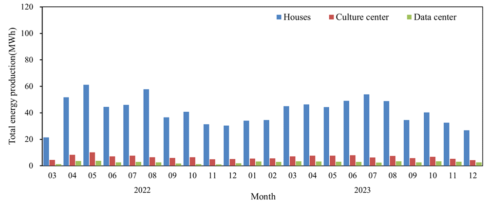 Fig. 5 Energy production for Houses, Culture center, and Data center.