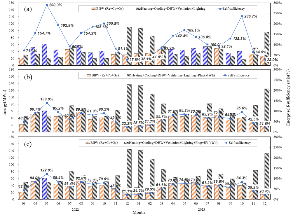 Fig. 6 Energy self-sufficiency ratio for residential buildings : (a) Case(1), (b) Case(2), (c) Case(3).
