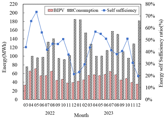 Fig. 8과 같이 전체 Smart Village Community 부하와 BIPV 발전량을 기준으로 산정한 총 에너지자립률은 41%로 나타났다. 2022년